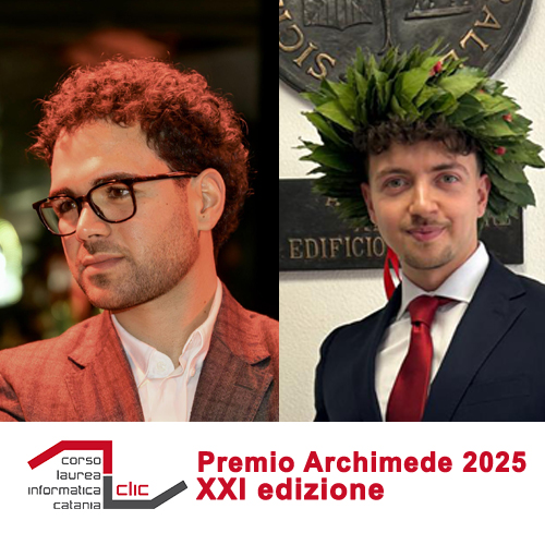 Istituito nel 2005, il Premio Archimede viene conferito annualmente ai laureati del corso di Laurea in Informatica, sia triennale che magistrale, che si siano particolarmente distinti per l’eccellenza del lavoro di tesi e il brillante percorso accademico. I candidati vengono selezionati su proposta delle rispettive commissioni di laurea. Per l’edizione 2025, la commissione giudicatrice composta dai professori Maria Serafina Madonia, Mario Di Raimondo e Corrado Santoro ha deciso di assegnare il premio al dott. Alfio Spoto per la Laurea Triennale e al dott. Riccardo Raciti per la Laurea Magistrale.